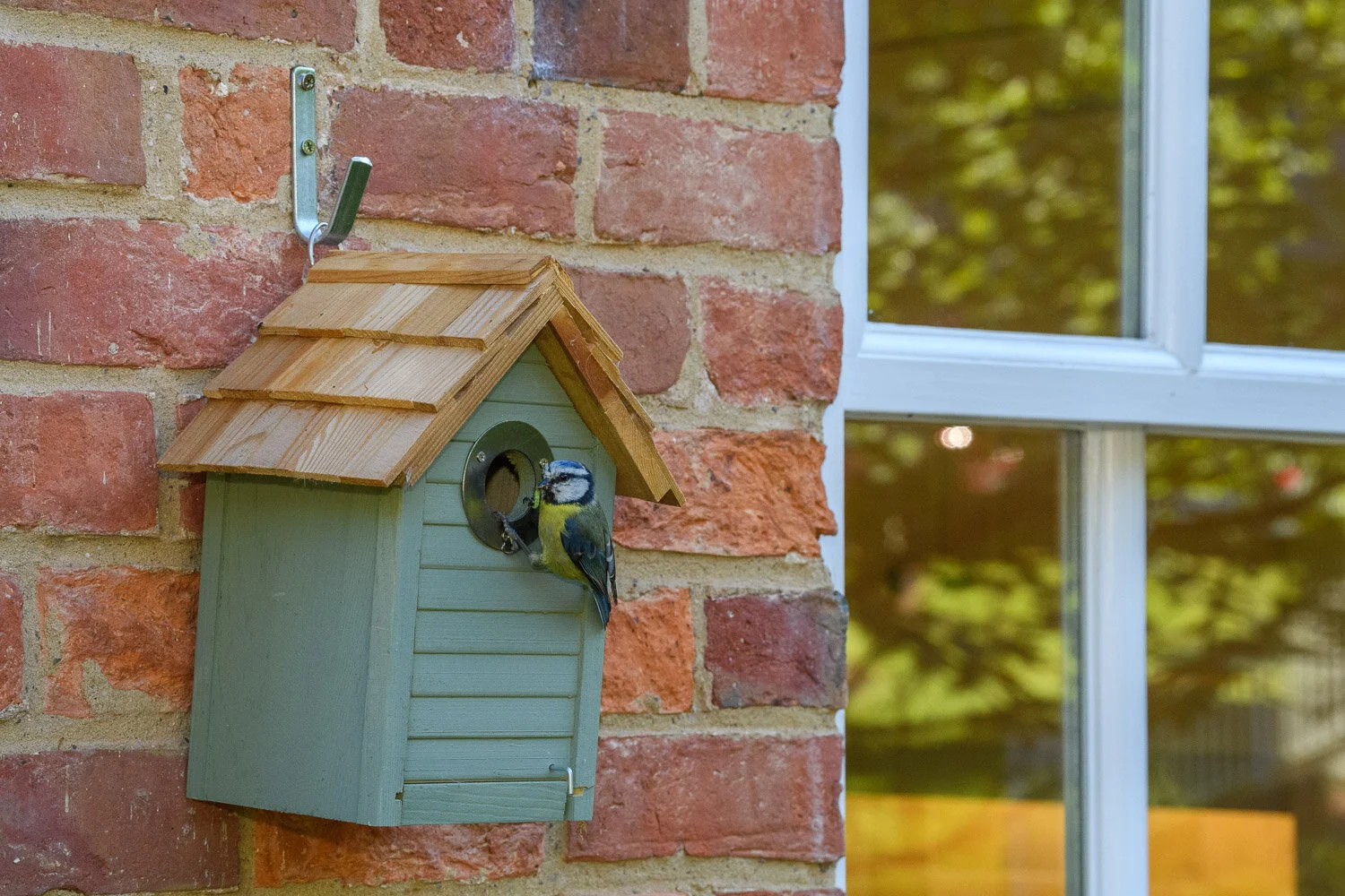 One of the trickiest parts of the project was to produce images of urban blue tits at their nest boxes. Due to the urban locations of the study sites in and around Birmingham, I had to find an alternative location to photograph blue tits at their nest. During the summer of 2019, a pair of blue tits attempted to build their nest in the exhaust vent of the oil boiler at my house. To protect the birds, I sealed off the vent with chicken wire and put up a nest box on the front of my house near the vent as an alternative nest site. As I hoped, the blue tits abandoned their attempts to nest in the vent and instead nested in the nest box. As the blue tits were accustomed to human presence - they regularly come to the bird feeder on the tree outside my front door - they were tolerant of a close approach and I was able to photograph them at their nest without any disturbance.