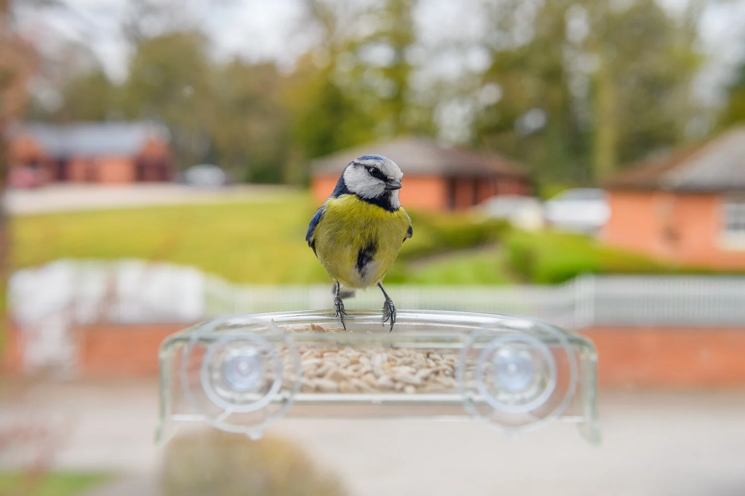 I also have a feeder set up on the upstairs window of my office. This sun flower hearts that I place in the feeder attract many birds including the local blue tits. The view looking out of the window with a blue tit perched on the feeder shows a unique perspective of the blue tits.