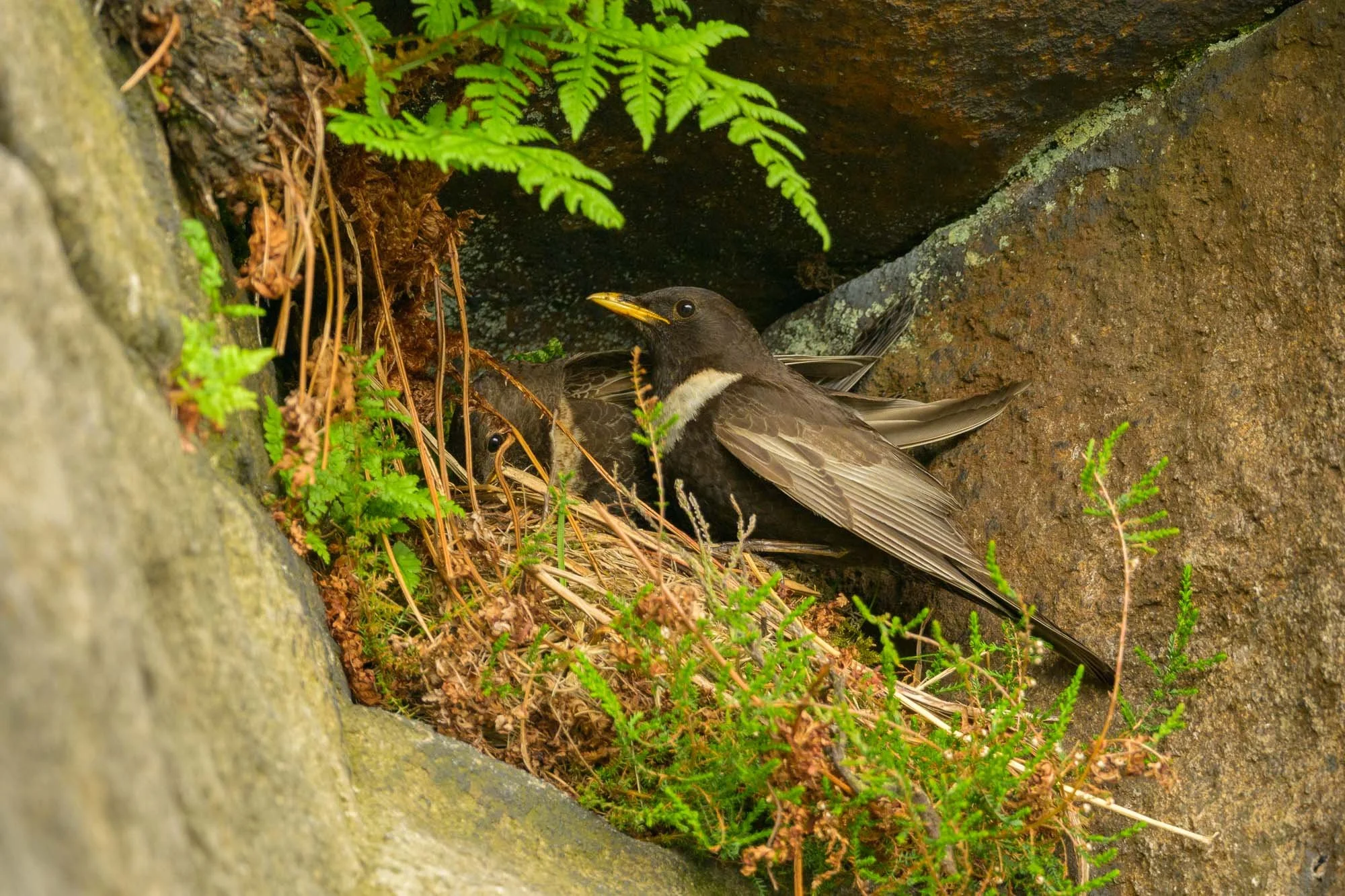 Ring ouzels nest in a varierty of locations within their preferred rocky habitat, including ledges on crags, under boulders and on the ground, typically with bilberry, bracken or heather as cover.